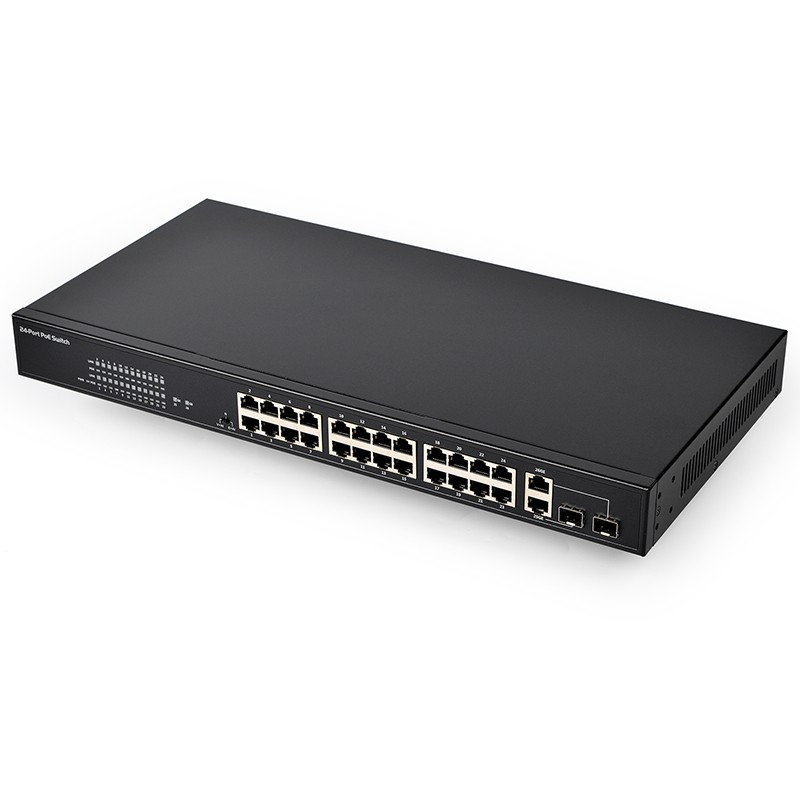24*10/100Mbps PoE ports, 2*10/100/1000Mbps uplink port,2*1000Mbps SFP Slot