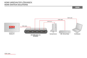 HDMI bağlantı teknolojisini destekleyen LCD, Plazma Televizyonlar gibi görüntü aktarım ürünlerine bağlanabilir. Giriş portlarına HDMI teknolojisini destekleyen 3 adet cihazın (Örneğin; DVD oynatıcı, uydu alcısı, Play Station 3, Dijital Kamera) takılmasıyla cihaz üzerindeki geçiş düğmesiyle ya da otomatik olarak çıkışa bağlı 1 adet HDMI monitör ya da HDMI TV'ye görüntünün sırasıyla paylaştırılması sağlanır