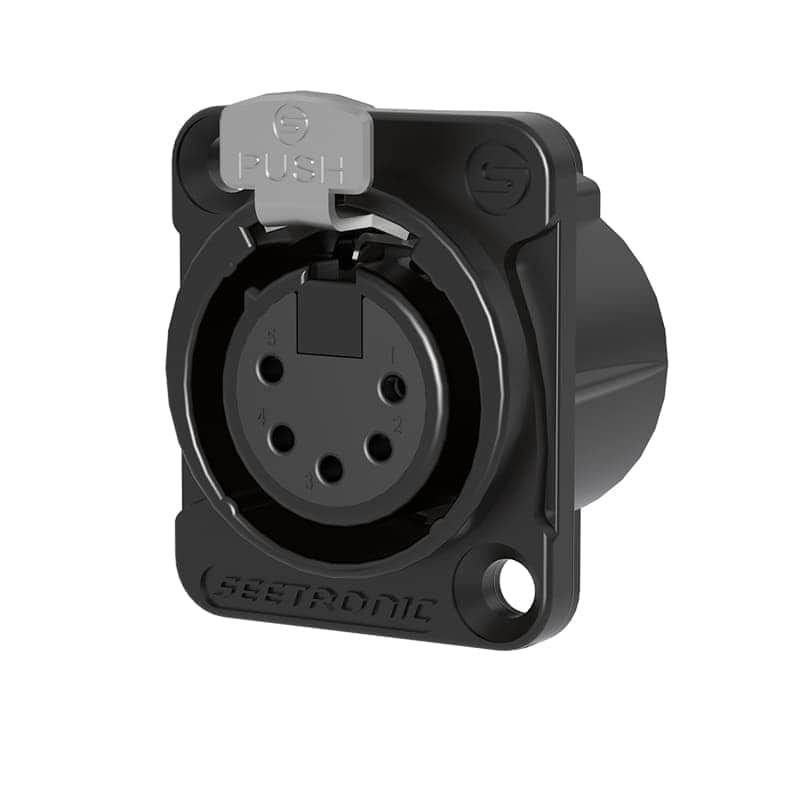 MK5F2C-B, çeşitli uygulamalarda güvenilir performans ve dayanıklılık için tasarlanmış yüksek kaliteli 5 pimli XLR dişi sokettir. Sağlam çinko alaşımlı gövdesi ve siyah kaplamasıyla hem estetik hem de dayanıklılık sağlar. Soket, endüstri standardı D tipi kurulum boyutlarına sahiptir ve panelin önünden veya arkasından uyumluluğu ve kurulum kolaylığını destekler.