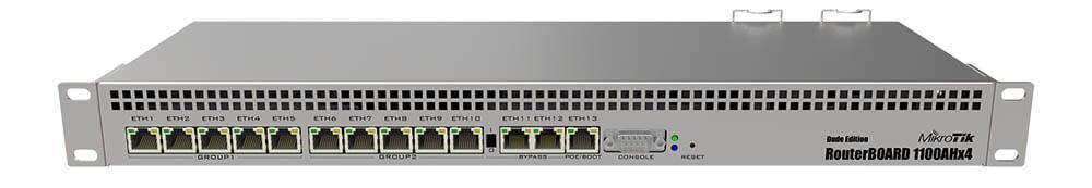 MikroTik RB1100AHx4 Dude Edition, 1.4 Ghz Annapurna Alpine AL21400 4 çekirdekli işlemci, 1GB RAM, 13 adet Gigabit ethernet portu ile 1000+ aktif kullanıcısı bulunan orta ölçekli ağ yapıları için hepsi bir arada çözüm sunar. 4 çekirdekli Cortex A15 işlemcisi sayesinde 7,5 GBIT gerçek trafik kapasitesine sahip olan router, güvenlik ihtiyacı bulunan ağlarda tercih edilen IPSec güvenlik protokolü için donanımsal hızlandırma desteği ile AES128 şifreleme türünde 2.5Gbps bant genişliği sağlayabilmektedir.