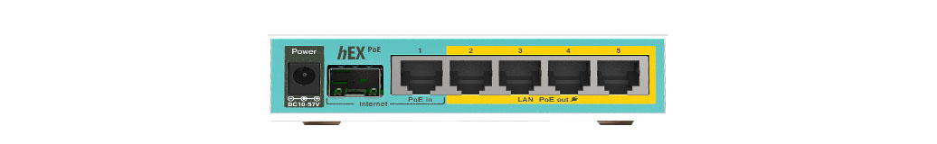 MikroTiK hEX PoE, 800 Mhz işlemci, 128MB RAM, 1 adet SFP, 5 adet Gigabit ethernet portu, 1 numaralı ethernet portu üzerinden 12v-57V arası DC Pasif PoE girişi desteği, 2-5 arasındaki ethernet portlarından sunduğu 802.3at PoE desteği ile 100+ aktif kullanıcısı bulunan küçük veya orta ölçekli ağ yapıları için PoE besleme imkanı ve gelişmiş ağ yönetim özellikleri sunar.