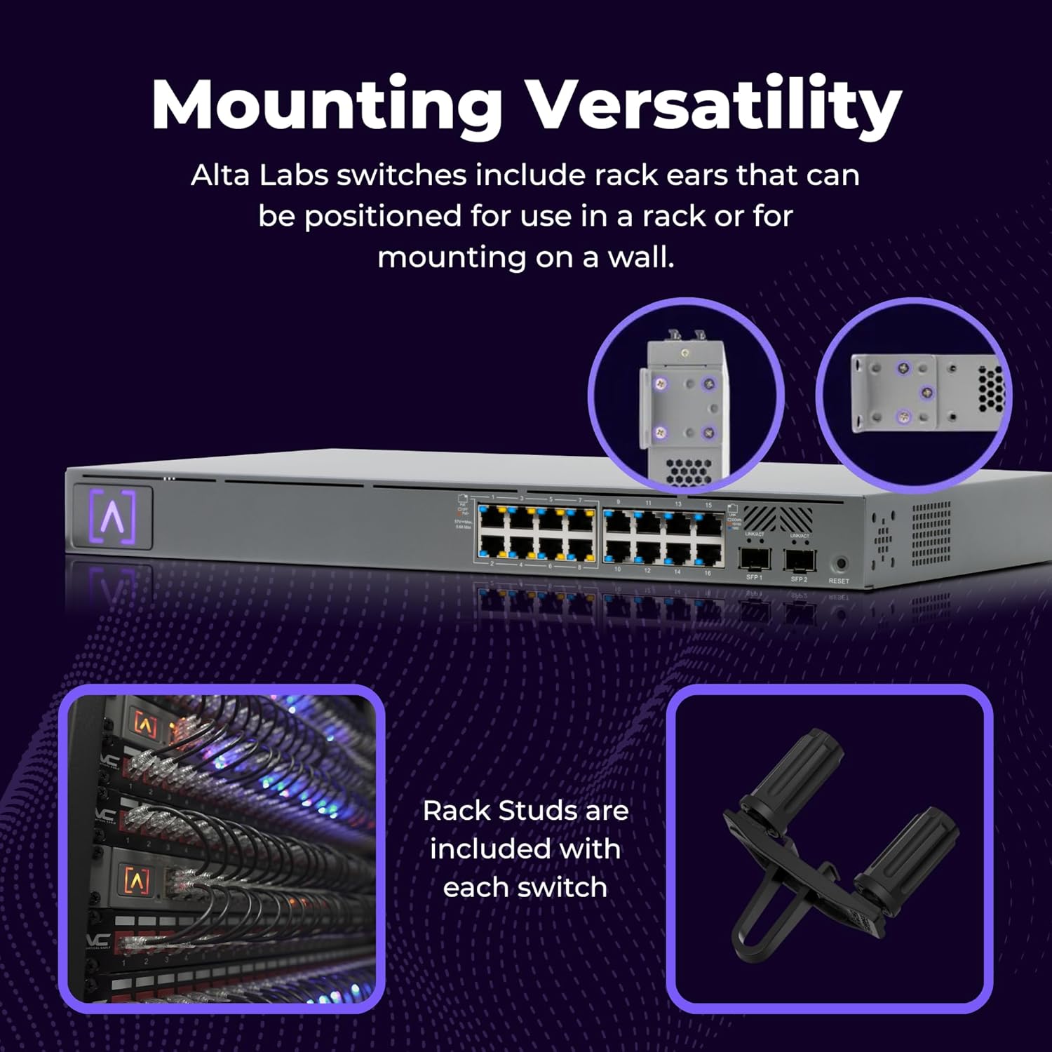 Rackmountable Design & Toolless Installation – Designed with included rack ears and Alta Labs’ Rackstud DUO toolless mount system, the S16-POE fits into standard 1U server racks or cabinets, delivering professional rackmount network infrastructure with minimal installation effort.