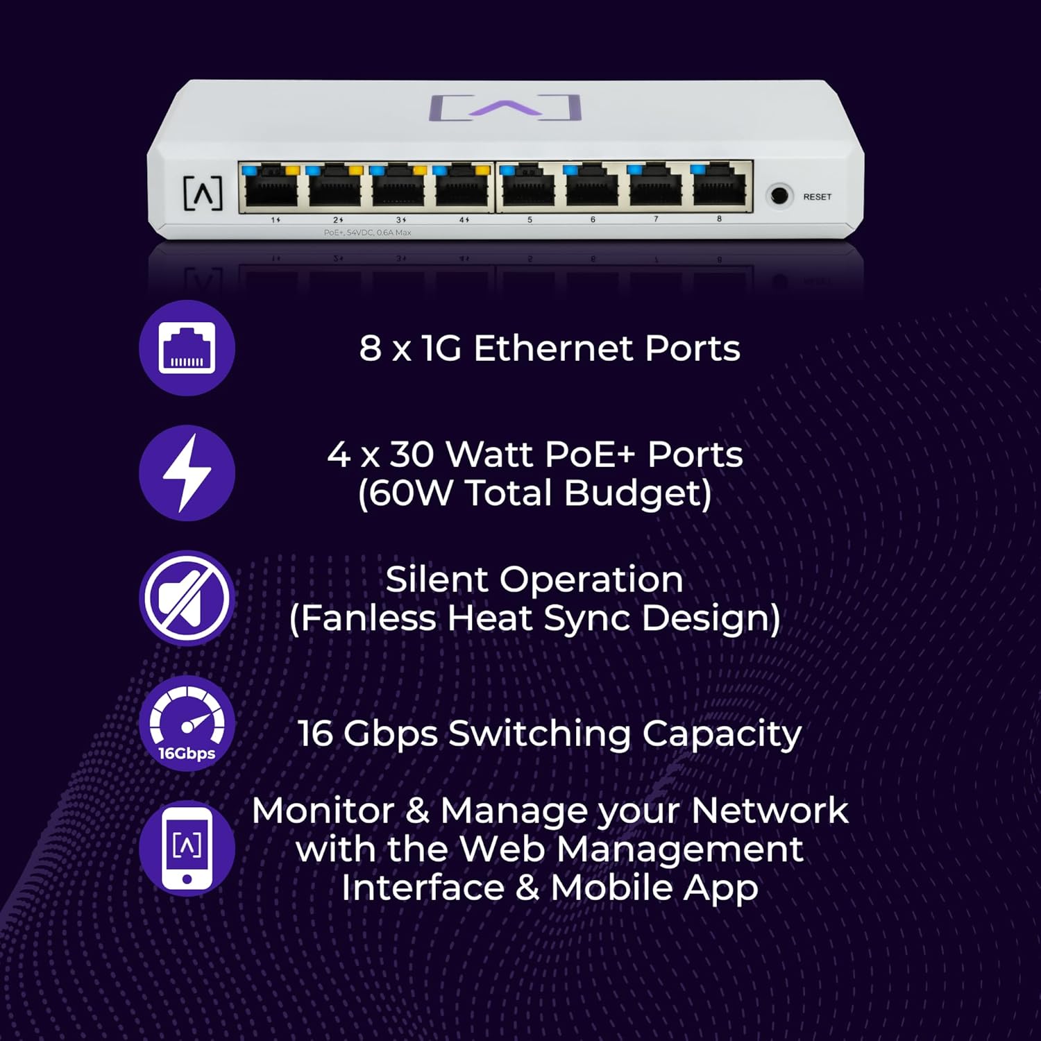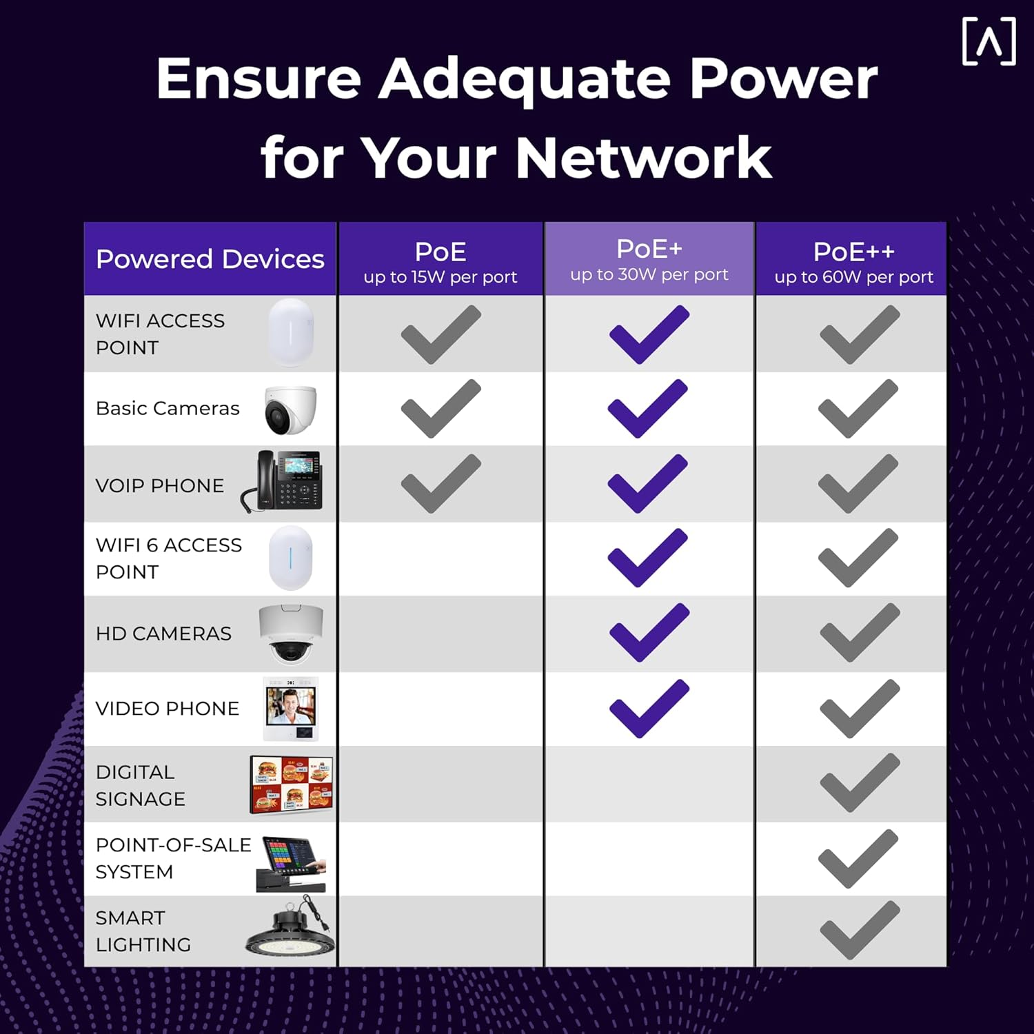60W Total PoE Budget – Simplified Cable Management Power multiple devices directly through Ethernet with the built-in 60-watt total PoE budget. Supports simultaneous operation of up to 4 PoE+ devices, reducing clutter and eliminating the need for separate power adapters. Perfect for clean and scalable network installations.