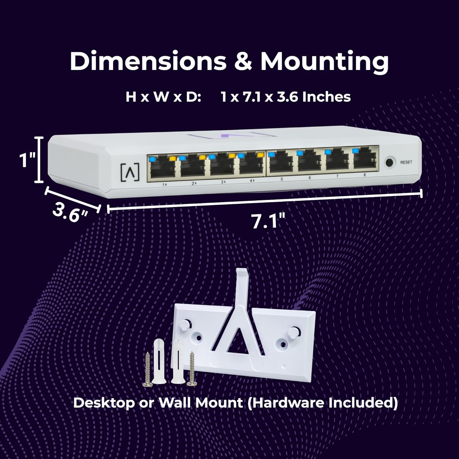 Compact, Wall-Mountable and Desktop-Friendly Design Flexible form factor allows for both desktop placement and wall mounting. This space-saving PoE switch fits easily into tight tech closets, workspaces, or home networks, giving you full control over layout without sacrificing performance.