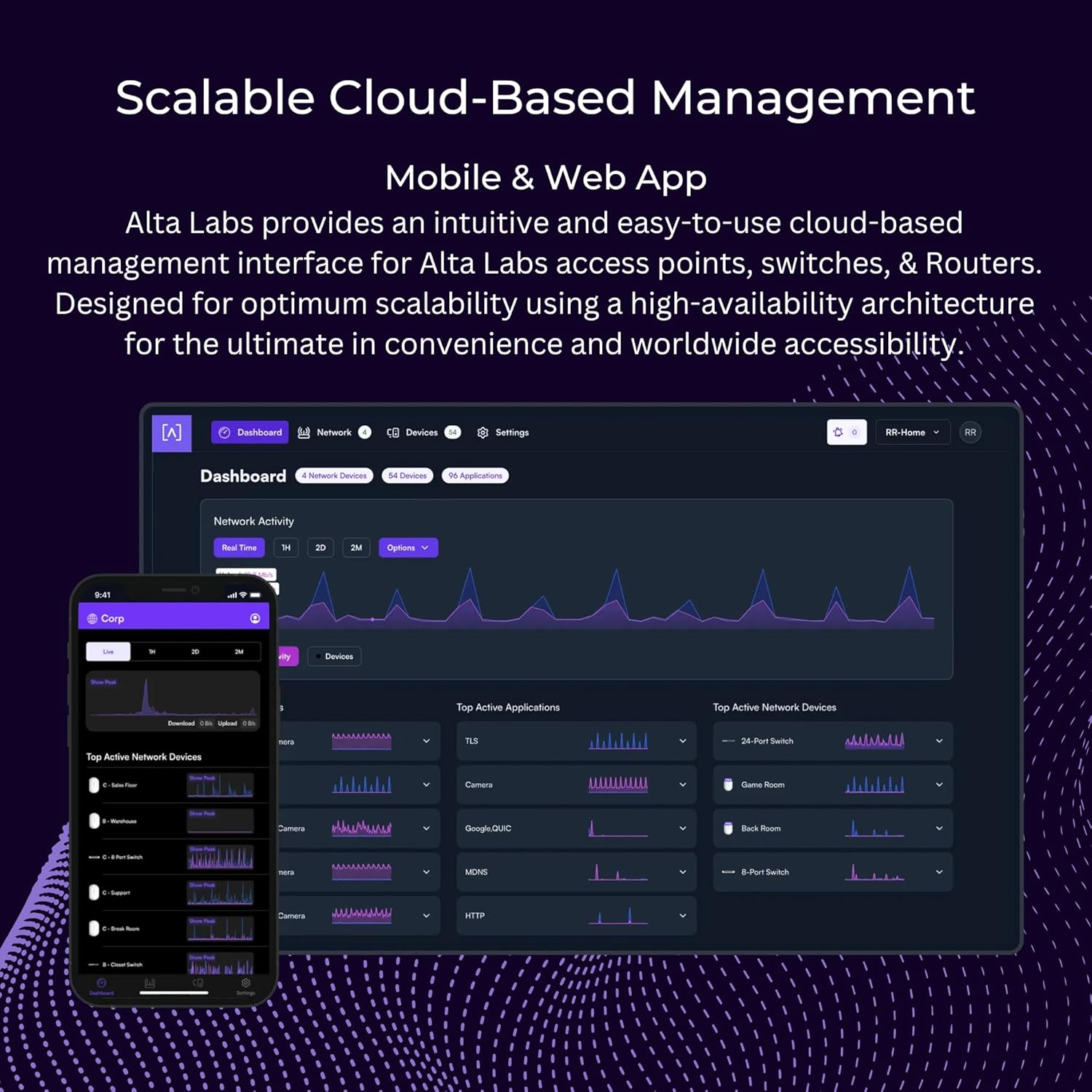 Cloud and Local Management via Alta Labs Platform Easily configure, monitor, and optimize your network using the Alta Labs Cloud Management Portal or local controller. Includes remote firmware updates, device monitoring, traffic analytics, and user-friendly configuration—all accessible from any location.