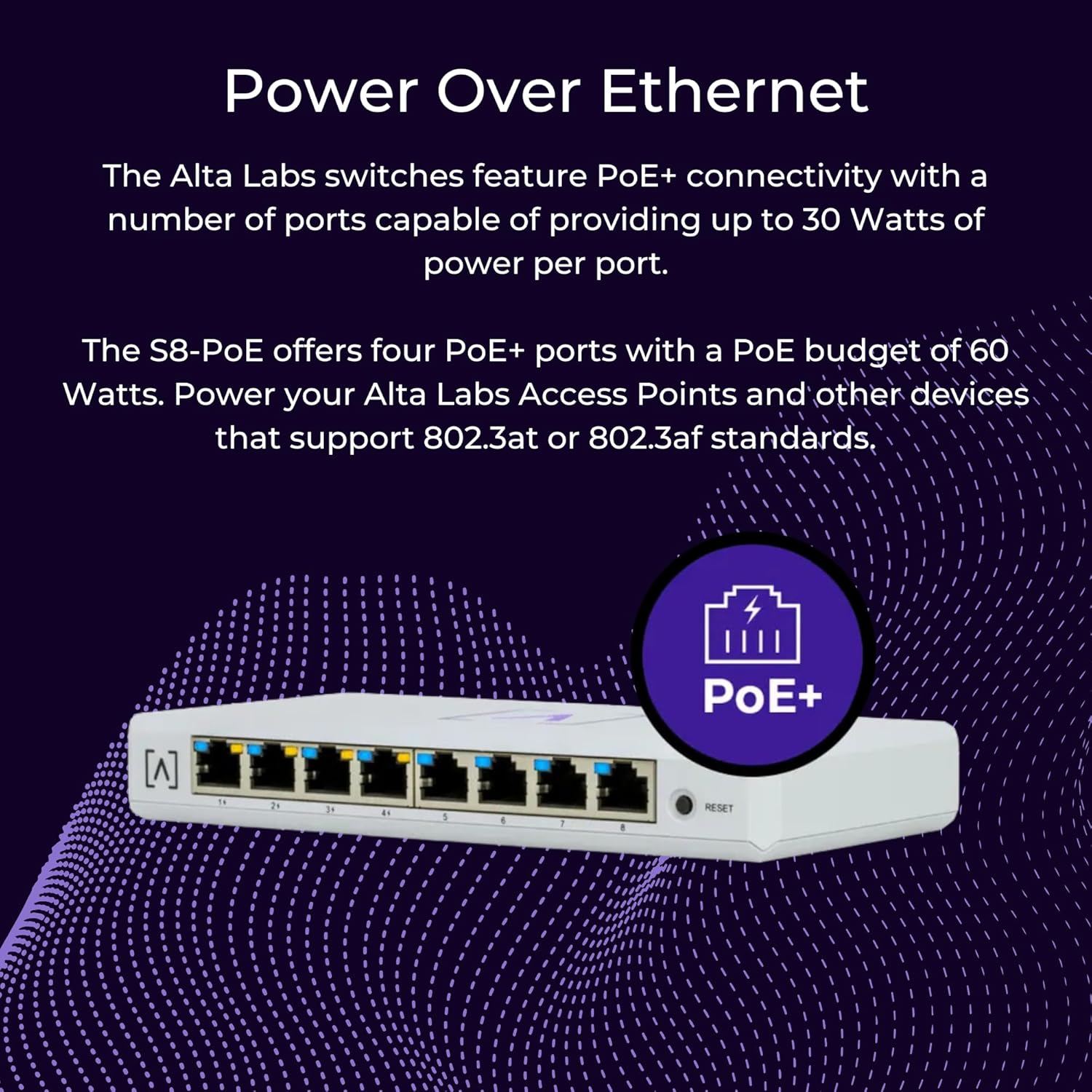 Seamless Integration with Alta Labs Ecosystem and Mobile App Designed to work flawlessly with other Alta Labs networking products, the S8-POE integrates into existing systems for scalable network expansion. Use the Alta Labs mobile app for on-the-go access, configuration, and system alerts, keeping your network performance in your hands anytime, anywhere. Silent Operation with Fanless Heat Sink Design