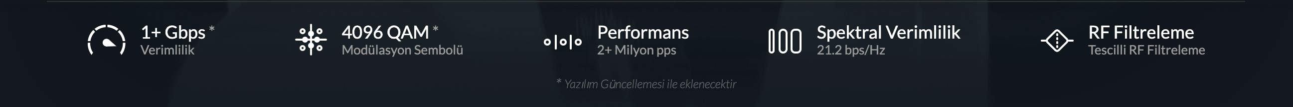 | 4096QAM'e kadar Adaptif Modülasyon | 4096QAM'ye kadar adaptif modülasyon oranları* (İlerleyen yazılım güncellemesi ile eklenecektir) |