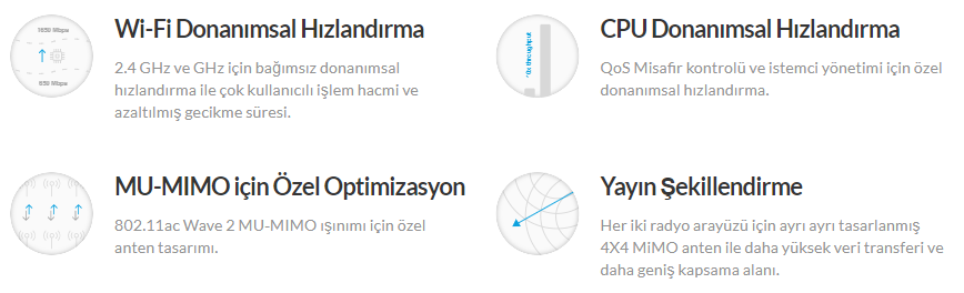 | Gelişmiş RF Verimliliği | Kullanıcı memnuniyeti ve sistem performansını en üst düzeyde tutmak için Airtime Fairness özelliği ile problemli istemcilerin ağ bağlantılarını limitler ve Band Steering teknolojisinin sunduğu özelik sayesinde sistemde bağlı olan desteklenen istemcileri daha yüksek bant genişliği sunan ve 2.4 Ghz frekansına nazaran daha az enterferasyon bulunan 5 GHz frekansına yönlendirir. |