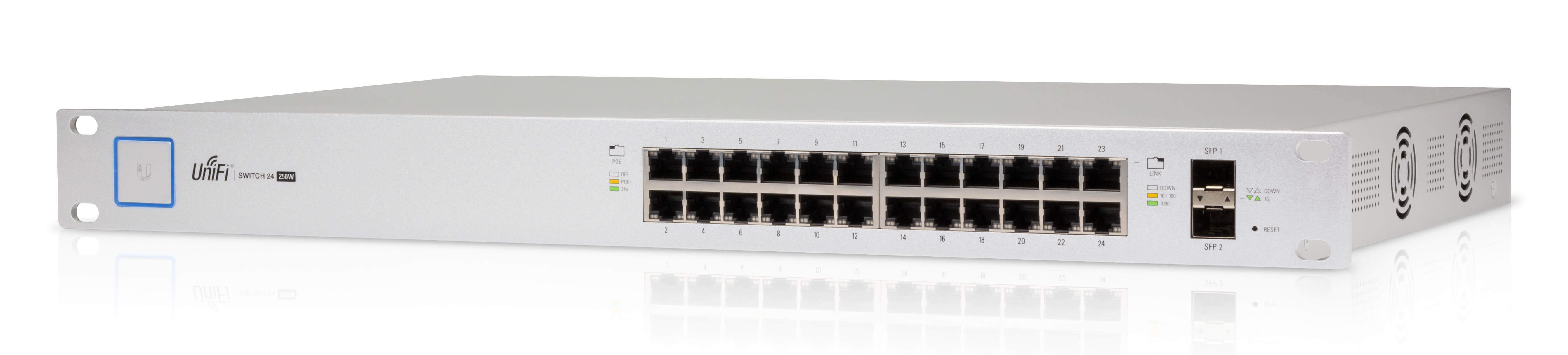 UBNT UniFi ürün ailesinin bir parçası olarak tasarlanmış UBNT UniFi Switch'ler, kurumsal yönetilebilir switch teknolojilierini sezgisel kullanım anlayışı ön planda tutlarak geliştirilen UBNT UniFi Controler yazılımı ile birleştirerek, çoklu cihaz yönetimi ve takibini tüm detayları ile tek bir ortak noktadan kontrol etme imkanı sağlamaktadır. UBNT UniFi Switch geniş çaplı kurumsal ağ ihtiyaçlarını karşılamak için tasarlanmış UBNT UniFi Switch US-24-250 modeli, Layer -2 ve Layer -3 standartlarını destekleyen gerçek yönetilebilir switch özelliklerinin yanısıra 802,3 af/at ve 24V Pasif PoE standartlarında 24 adet Gigabit ethernet portu, ve 2 adet SFP portu ile gelmektedir.
